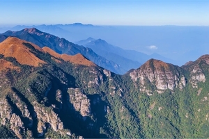 后山顶1000—1300米高度发育着壮观的砂岩绝壁。绝壁上方是金黄色的大草坡,宛如给大山戴了一顶黄帽子。在无人机的镜头下,“黄梅雪后”四座千米山,以及更远处的茶岩顶、船底顶一览无余。