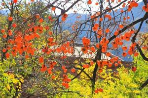 近日、柿子树上叶子开始掉落,留下红红的柿子与远处的高山形成一道天然画卷