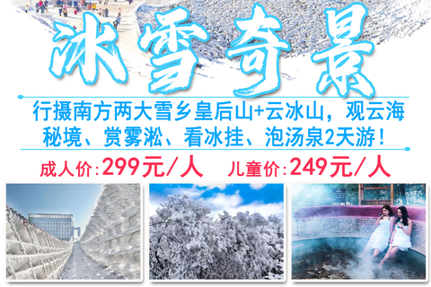 09:00 左右到达云冰山风景区,乘景区环保车前往南国雪乡之称的【云冰山景区】于湘粤交界的云冰山,以云海,冰雪奇观而得名,一览众山小的梦幻云海,奇特冰挂堪称一绝;每年的"雾凇 雪淞 雪景"奇观轮番上阵,素有南方"北国风光"的美誉(另外说明:如遇道路结冰等恶劣天气 ,景区为安全起见,云冰山中转车可能暂停且费用没的退,徒步上顶约3公里40分钟左右);
