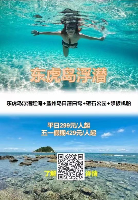 ③东虎岛浮潜80元/人:往返快艇+浮潜装备使用(潜镜,呼吸管,救生衣),全程约2小时(大小同价)