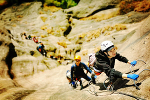 2. 飞拉达高级线路适合身高1.5米以上、体重130公斤以下人士,60岁(含60岁)以上、15岁(含 15岁)以下未成年人不得攀登高级线路;