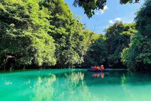 拉雅瀑布精巧醉人,水珠飞溅;而长不到600米之水上森林,树根盘在错石上,清澈的水流冲刷着青石,行走于其中,若身临琼瑶仙池;(注:鸳鸯湖景区划船属景区内不必须自费项目,划船费30元/人)。