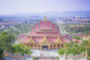 从山门至万佛塔,佛祖释迦牟尼的生平巧妙的融入到景观和建筑中,使得每处细节都有说法、故事,从万佛塔广场俯视景洪市区,旖旎的热带风光尽收眼底。