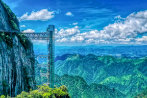 13:00 前往上层栈道,可以走路,也可自愿体验《流浪地球2》现实版太空垂直电梯(单程40元/人,往返80元/人,自愿自理不强制!),依傍悬崖而建,海拔高度1600米左右,连接上下两条无障碍游步道,游客从山底达到山顶,借助这部电梯仅需59秒,就可以“穿越”50层楼的高度。