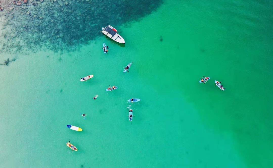 09:00 继续在岛上玩桨板,浮潜,昨天没有玩尽兴的亲们可以岛上嗨起来,大家在海上用桨板摆造型,早上的海水更清澈,如果玩浮潜,能看到清澈海底世界。