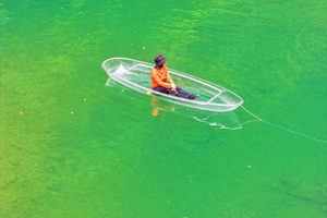 屏山峡谷深达百余丈,溪水碧蓝清澈见底;如果遇到晴天,阳光折射入水面,行舟于上宛如悬浮在空中一般。适时乘船游览,小舟行驶在峡谷底部的水面上滑动,宛如悬浮在空中一般。