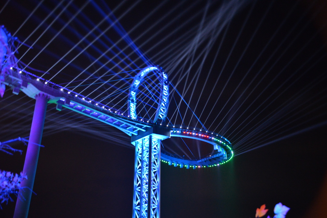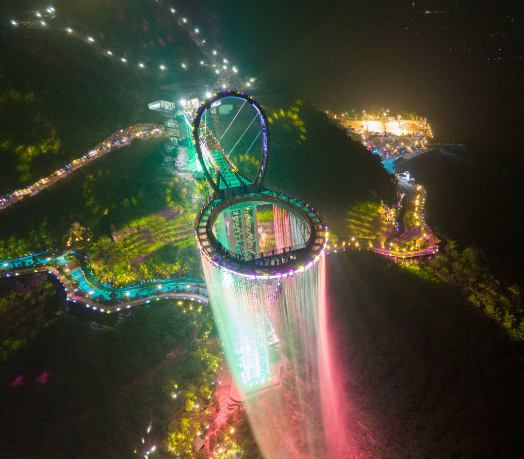 网红大球拍天门悬廊外侧处于漂流河道上方,离地垂直高度达500米,此高度是广东目前玻璃廊桥同类产品的4-5倍, 视觉震撼,超酷炫。