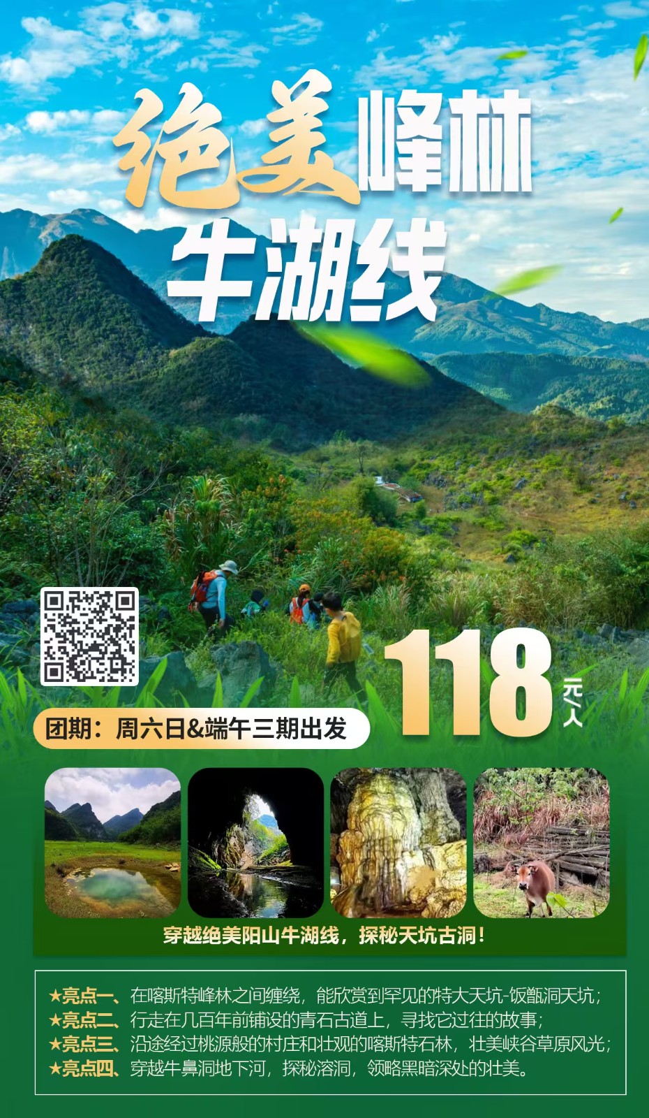 在阳山众多的峰林中,牛鼻村与湖洞村之间,隐藏着一条美丽的徒步穿越线路,这条徒步穿越线路长约13公里的徒步线路,人们把它称作牛湖线。