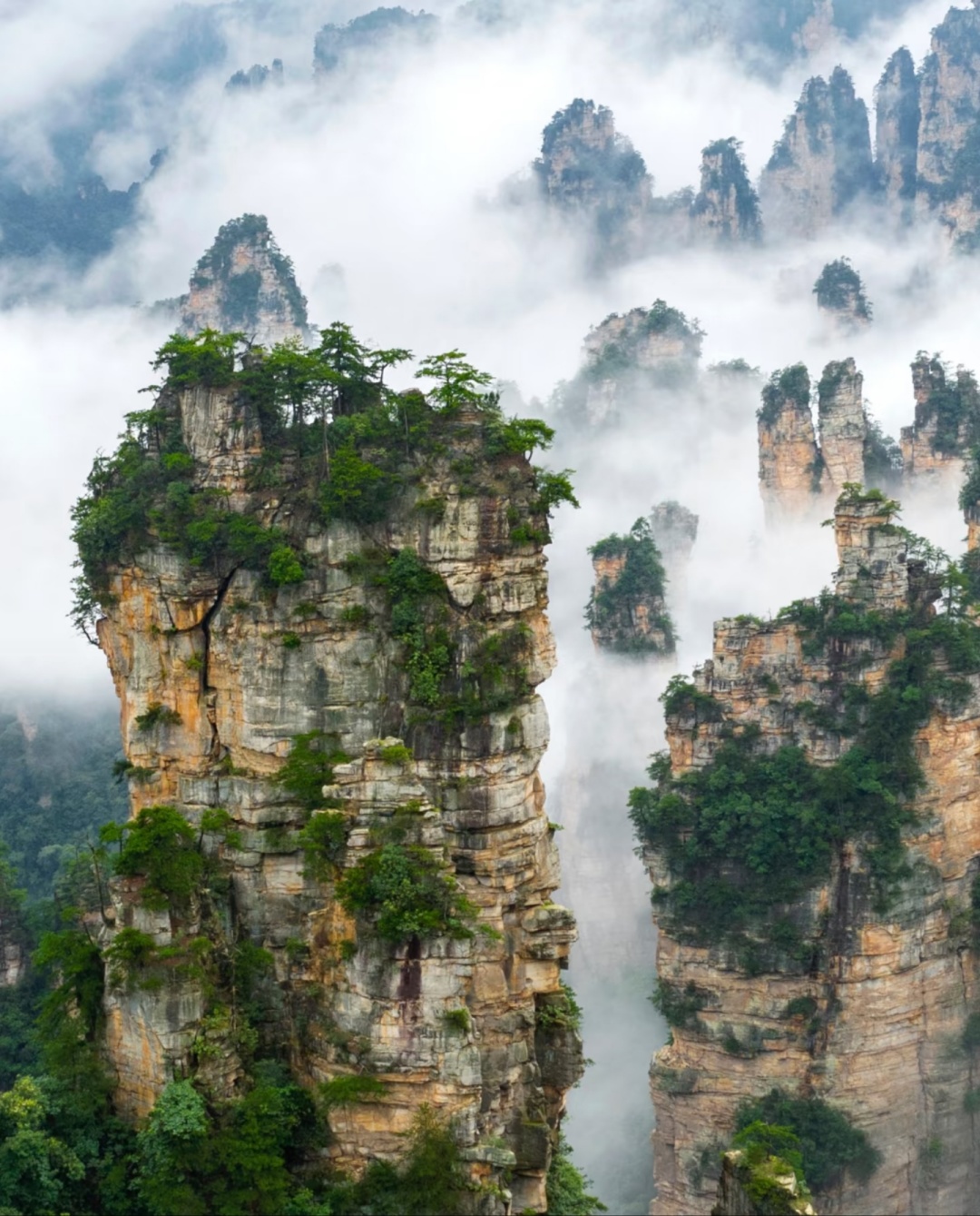 三千多座造型奇异的山峰拔地而起,满目青翠。峰谷间云雾缭绕,随处可见飞瀑溪水,风光美不胜收。每一幅照片单独拿出来,都是大片!
