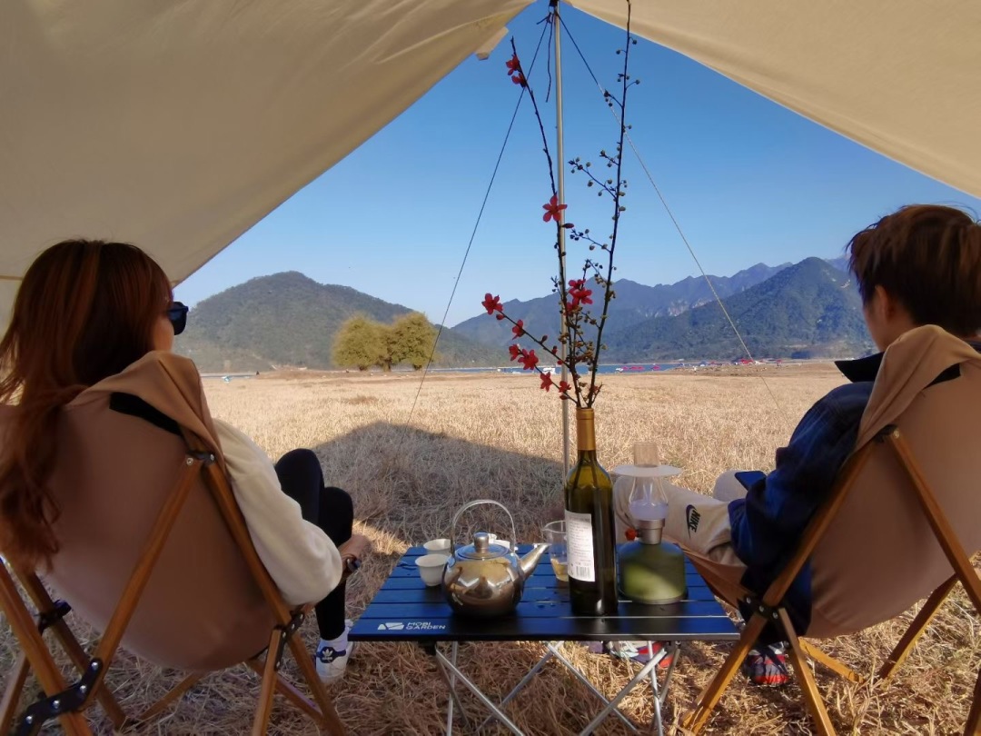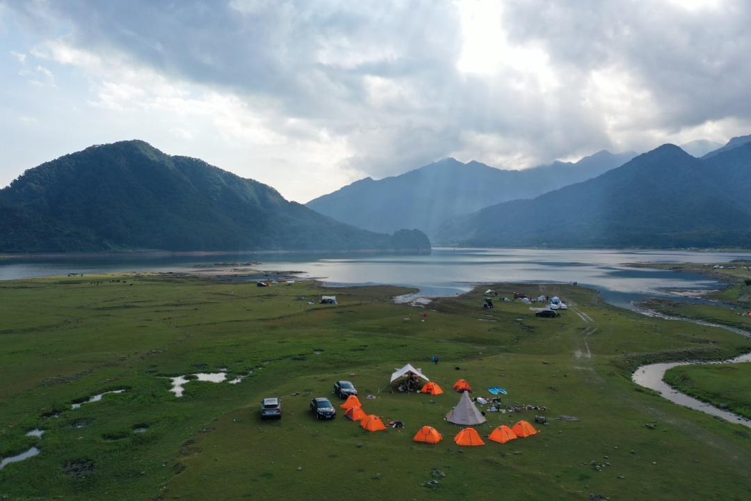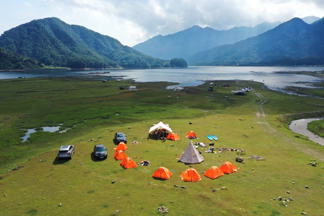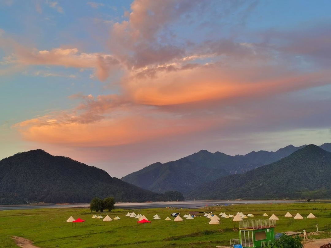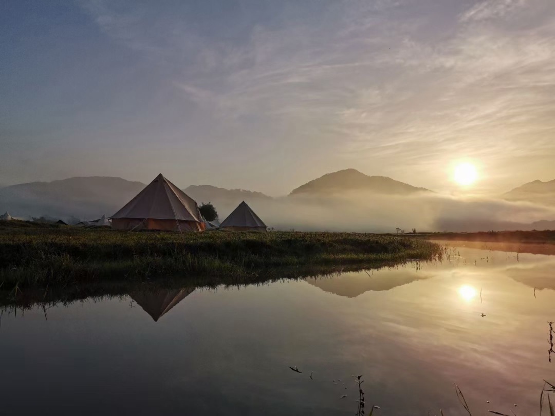 15:30罗坑大草原露营,大草原旁边就是罗坑水库,我们毗邻水库扎营,安营扎寨:分配人员,现场领队会教大家如何搭建帐篷(帐篷露营需自带睡袋),也可以区域附近的野温泉泡温泉
