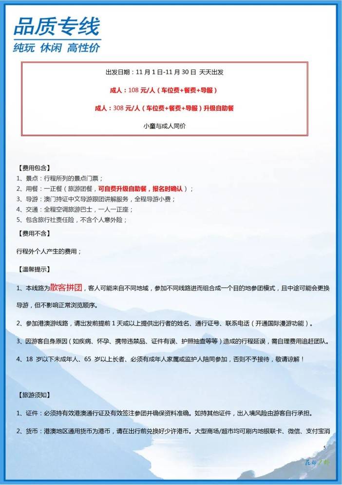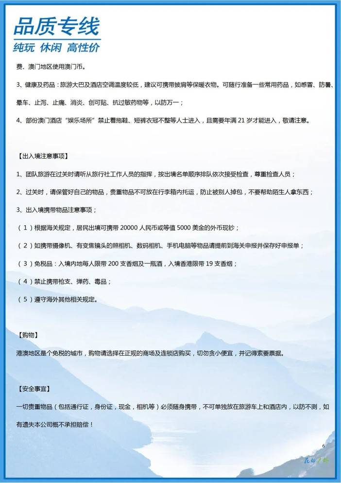5.本线路为出境游,需要港澳通行证,且签注需在有效期内,如因证件问题无法过关,一切损失自理,敬请参团游客自备手机并开通国际漫游功能。