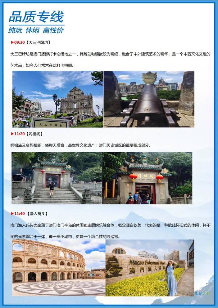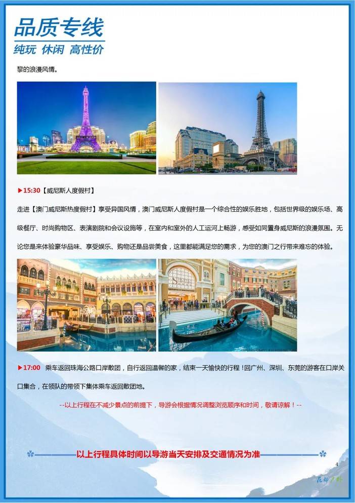 集合—公路口岸—大三巴牌坊—妈祖阁—渔人码头—午餐—澳门回归贺礼陈列馆/金莲花广场—钻石表演—澳门巴黎铁塔—威尼斯人—返程