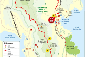 龙脊道徒步路线图路线起点位于石澳道近土地湾村的港岛径第八段,走过一段林荫小路后,眼前就是蓝塘海峡的美景。在这里你可以眺望山下的石澳泳滩,还有石澳半岛外的两个小岛五分洲和大头洲,蓝天碧海、水天一色,景致迷人。