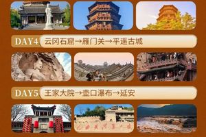 早餐之后开往王家大院大约车程1个半小时到达王家大院游玩五巷六堡2小时,午餐以后前往壶口瀑布到达后听黄河的咆哮声、看水底冒烟、跨省彩虹游玩2小时后开往延安入住酒店,晚上游玩宝塔山灯光秀,二道街品尝陕北美食,麻辣羊蹄,羊肉面,油泼面,肉夹馍等等……