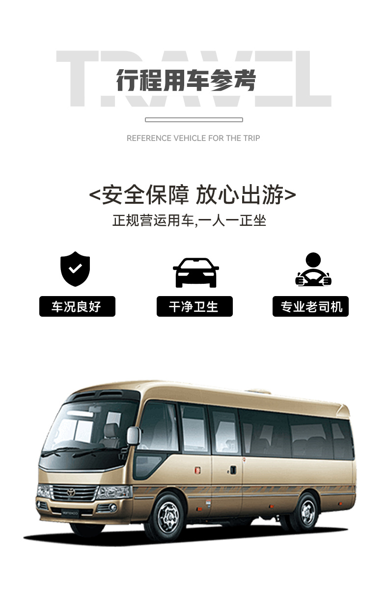 1、交通:根据人数选择合适车型,一人一座(①行程内用车、路桥油费);