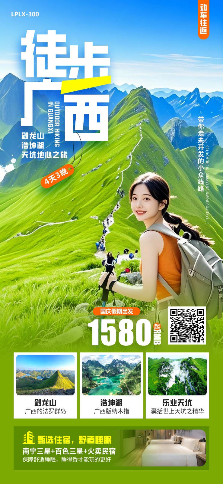 2.住宿:全程3晚酒店住宿(南宁三星,百色三星,火卖民宿),单人报名组织方优先安排同性拼,如遇到无同性法拼房平日需要补房差300元,国庆房差600元(以报名时客服相互沟通确认为准!)