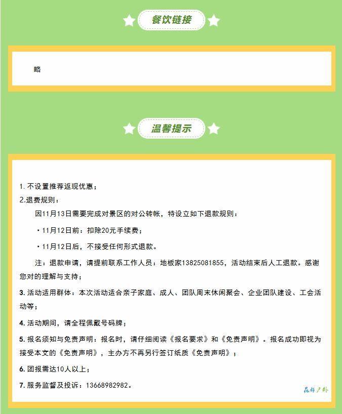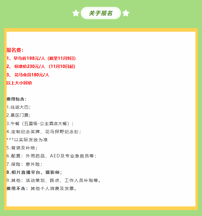 2、如遇到天气恶劣等不可控因素导致本次活动无法如期举行,活动会通知安排延期举行,名额也自动延期。