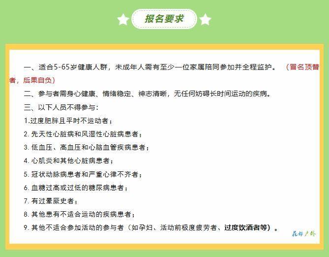 1、户外运动,存在一定的风险性,请根据上文《报名要求》判断自身是否适合参加,不适宜人群坚持参与的,则产生的一切后果及责任由参与者本人或其监护人承担。