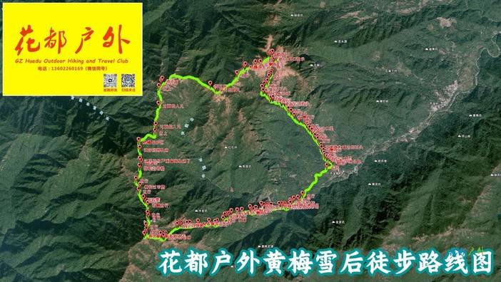 大部分驴友徒步穿越“黄梅雪后”,都喜欢从韶关市曲江区樟市镇芦溪村上山,依次登顶黄思脑、梅花顶、雪花顶和后山顶,最后在后山村结束行程,全程约16公里,累计爬升1600米,耗时8—12小时。