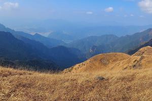 后山顶海拔1368米。山顶全是金黄色的芒草,视野极为开阔。向东望去,草坡尽头连接着一条长长的山脊线,那就是让驴友魂牵梦萦的另一条绝美徒步穿越线路——“五子登科”。