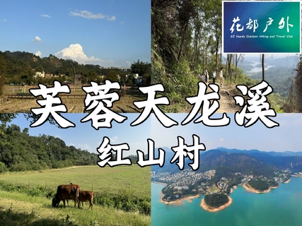 ▷徒步路线:本次活动全程约16公里左右穿越线。起点为花都芙蓉温湖驿站,途径福源水库>天龙溪>茅村,终点为红山旅游村。有山路全程爬升约400米,徒步完成后可在红山村自由打卡,全程计划用时约5-6个小时。