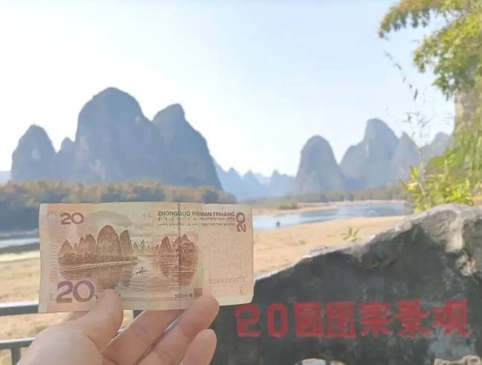 元宝山加上后面的群峰以及右边的群山组成了二十元人民币背面图,这里的蓝天白云青山绿水翠竹倒影,为桂林山水的典型代表,凝重中透露着灵动之气。