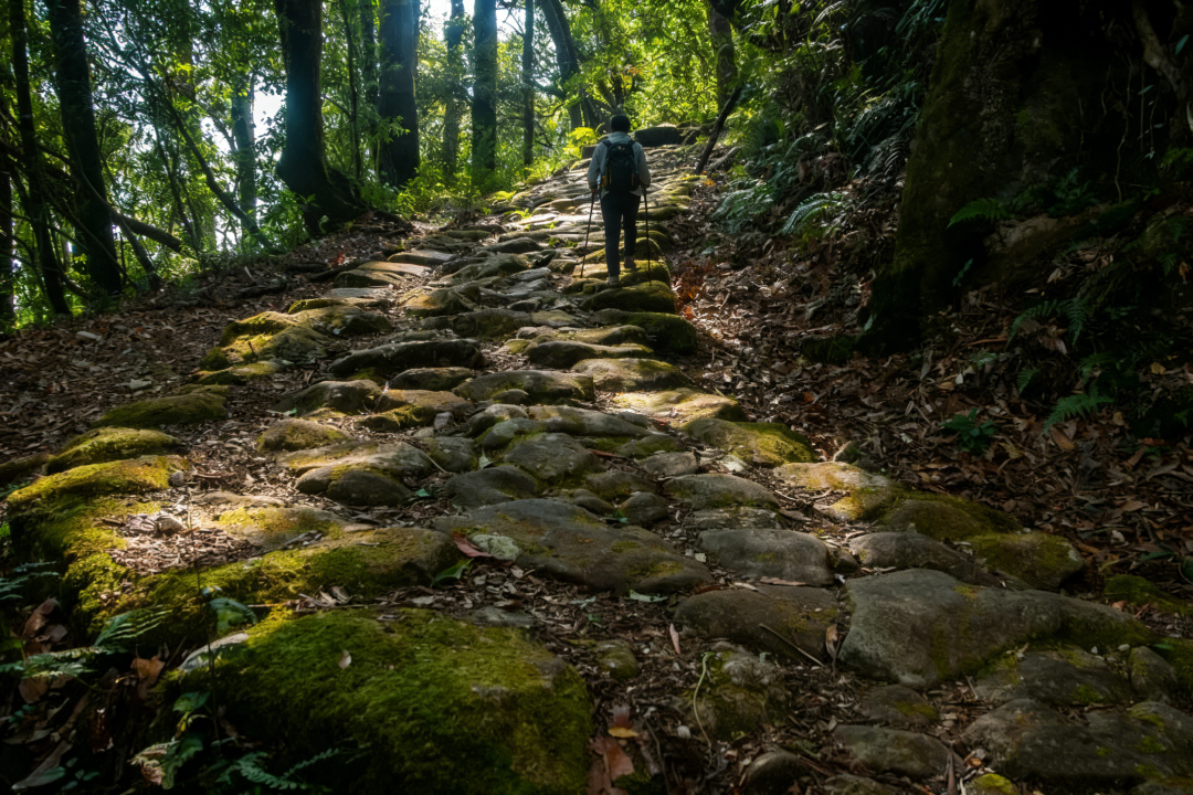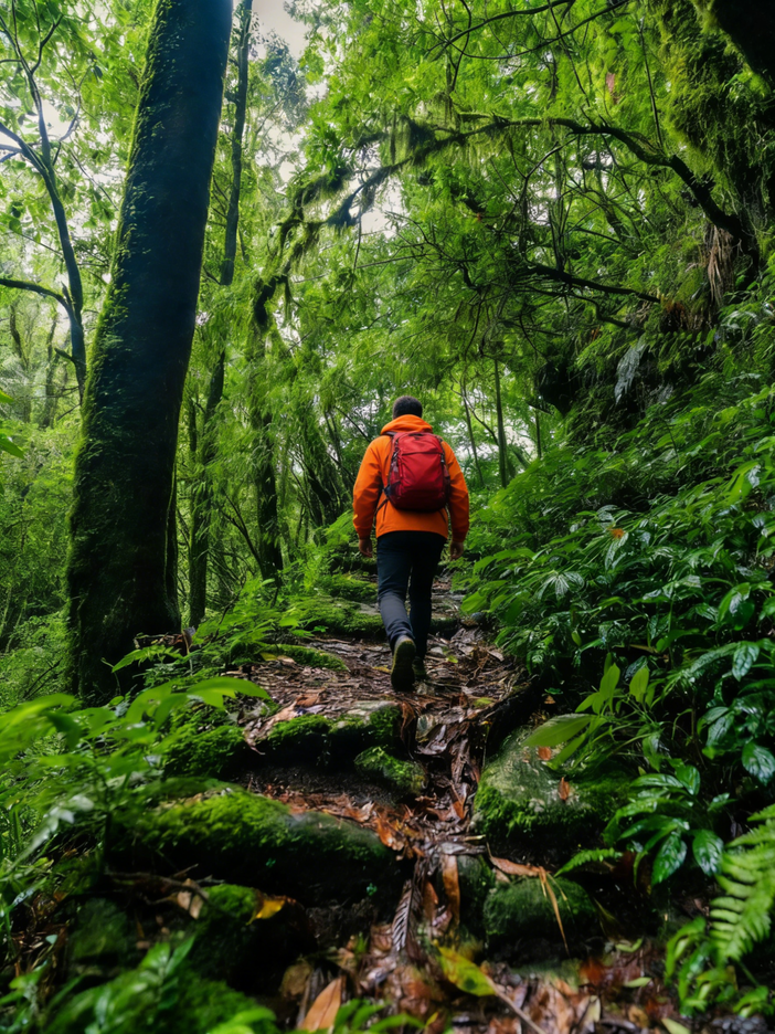 窜龙线的徒步,是一场从绿意到火红的穿越。初入森林,便被满树的“毛毛球”撞了满怀——那是松萝与苔藓交织的绒球,像被施了魔法的抹茶蛋糕,软乎乎地挂在枝桠间,风一吹便轻轻晃动,仿佛下一秒就要飘进童话里。阳光透过层层叠叠的枝叶,在林间洒下碎金,脚下的小径被落英铺成红毯,每一步都像是踩在春天的心跳上。