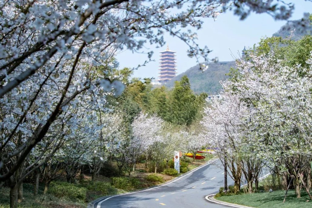 梅香还未散尽,白玉兰亭亭而立,二月兰铺成紫蓝花毯,桃花溪粉霞漫岸,樱花大道渐次盛放。
