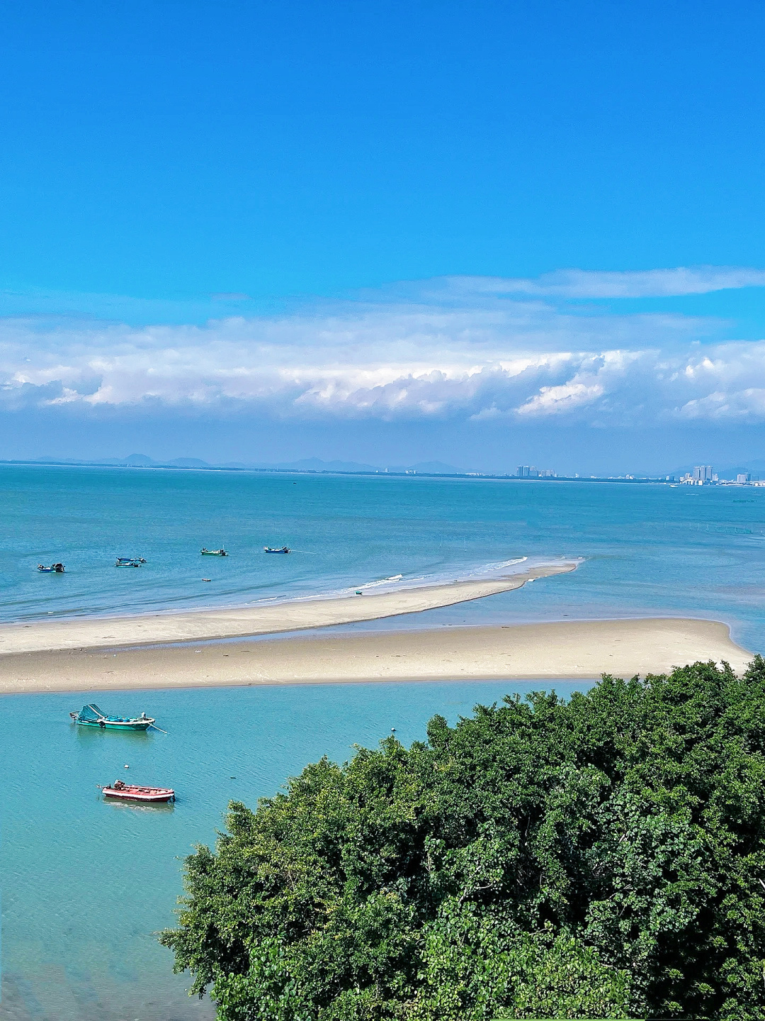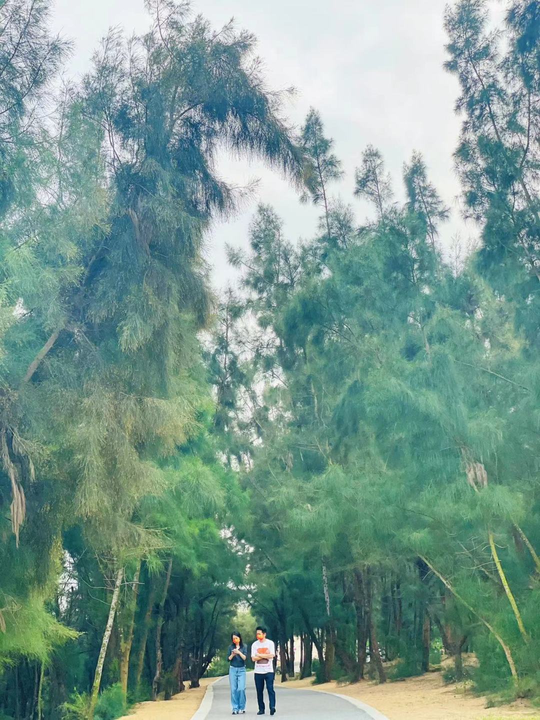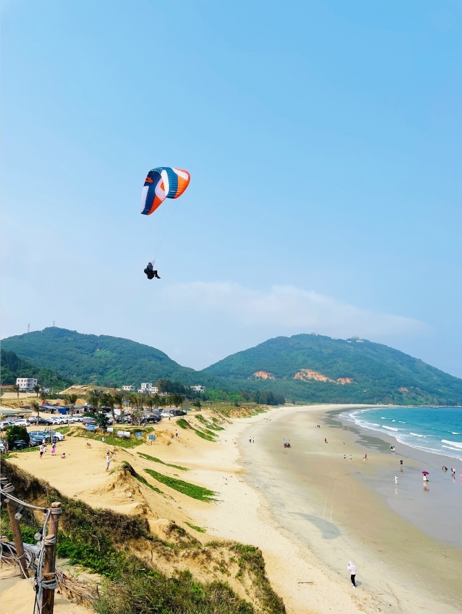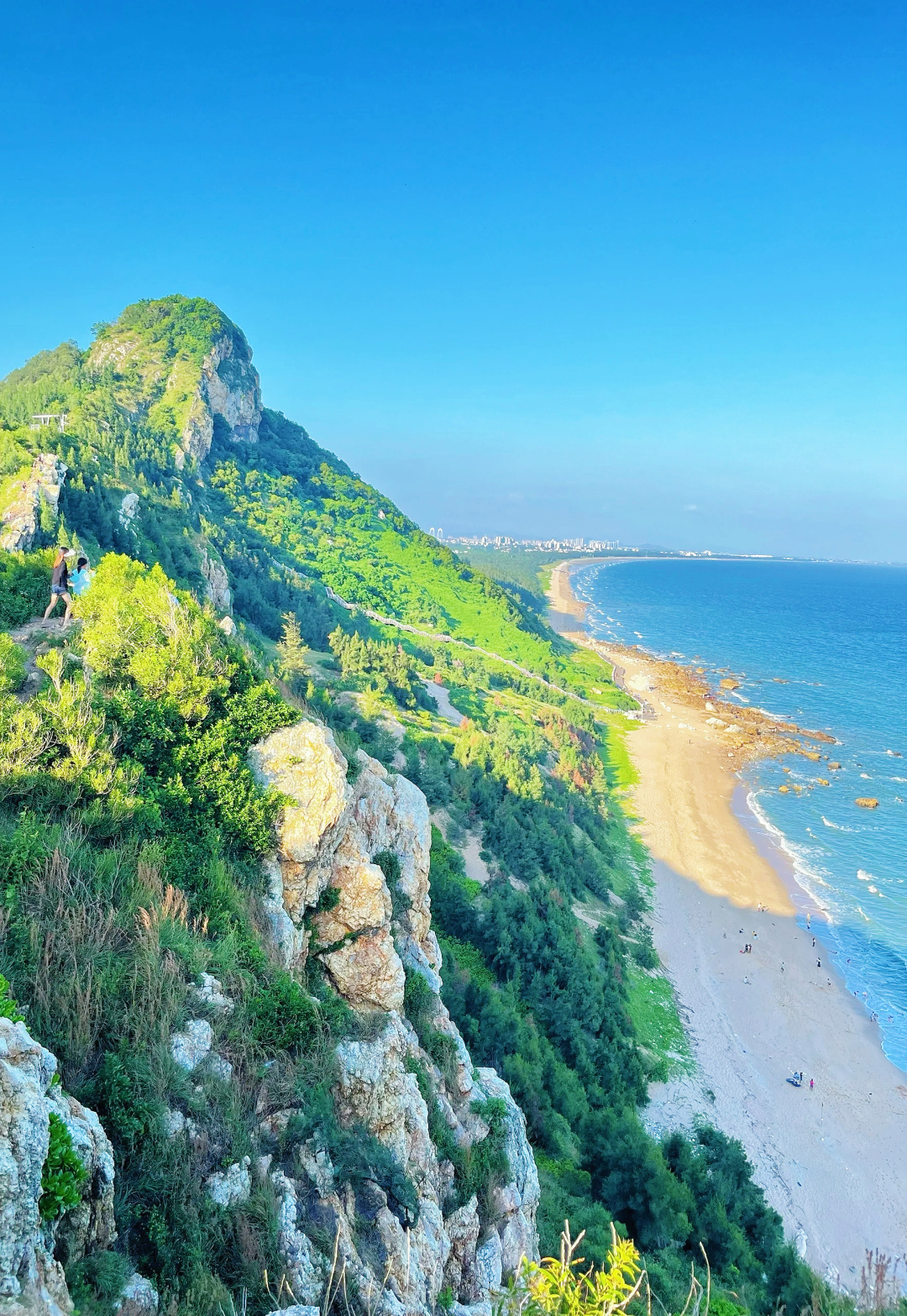 蓝天白云下,洁白的沙滩映衬着葱绿的林带,为国内少见,素有“东方夏威夷”之称。