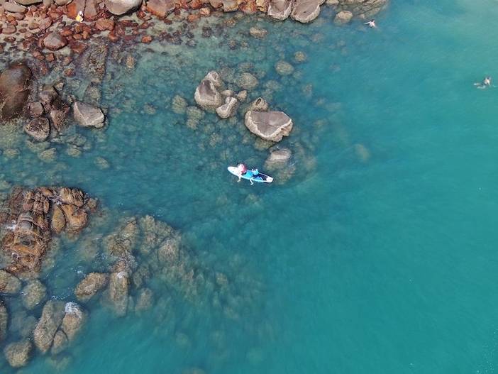 2人一条桨板,自由自在,遵循自己的速度,慢慢的在海上划行~
