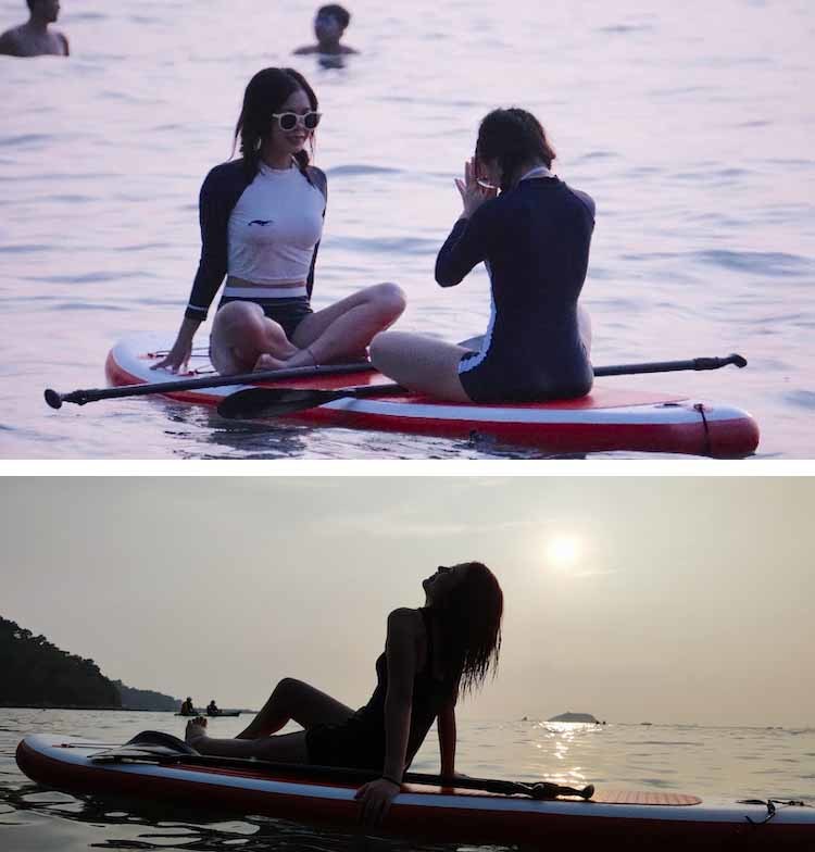 2人一条桨板,自由自在,遵循自己的速度,慢慢的在海上划行~