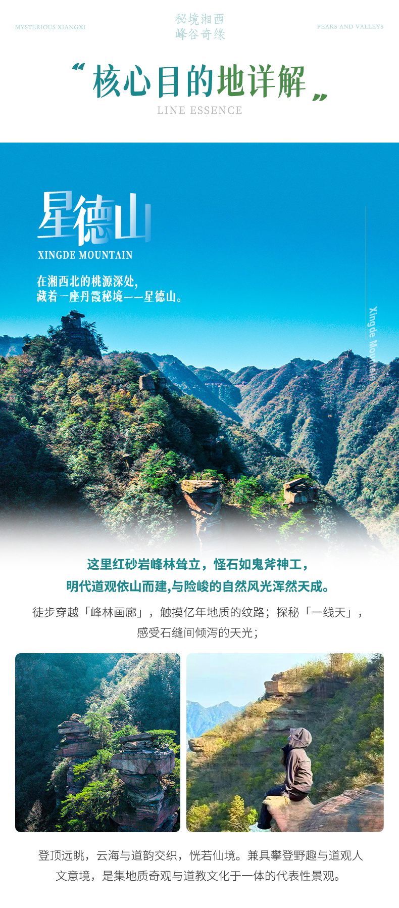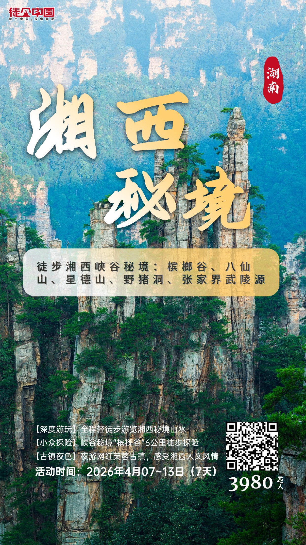 这一次,我们将带你深入湘西秘境——从澧水之畔的星德山、八仙山出发,沿着湘西之子·沈从文的笔端,徒步穿越槟榔谷的溶洞迷宫。探秘野猪洞的原生态峡谷,体验一洞一世界的奇幻,夜宿挂在瀑布上的芙蓉镇,听一夜瀑声,用脚步丈量张家界的奇峰异景。