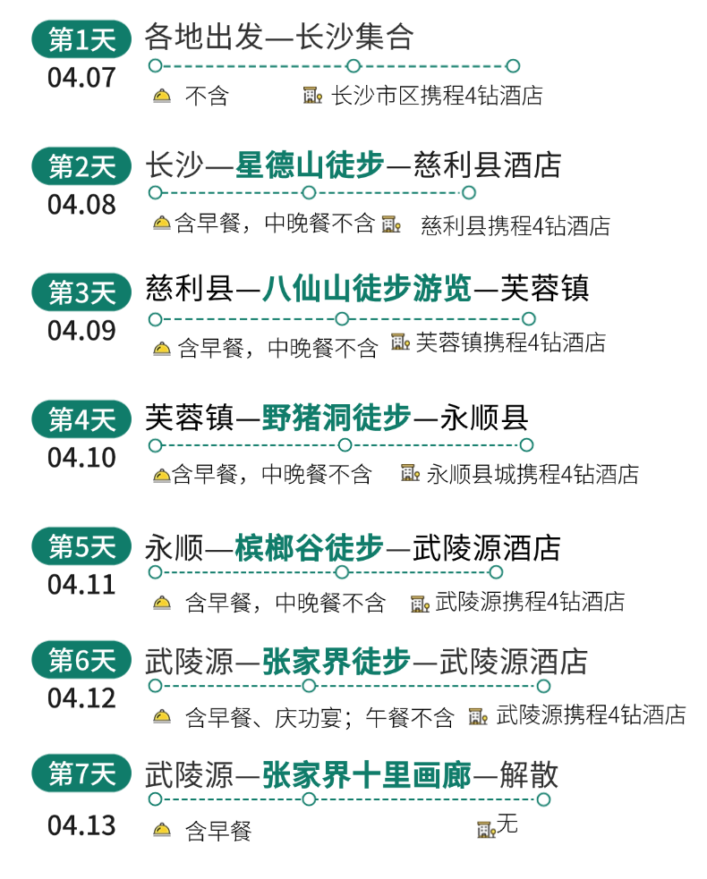 早餐后从长沙乘车约3.5小时前往星德山。徒步穿越经典小环线,沿途欣赏奇特峰林、一线天等景观,中午路餐,徒步约5小时。下午乘车入住慈利县城酒店。